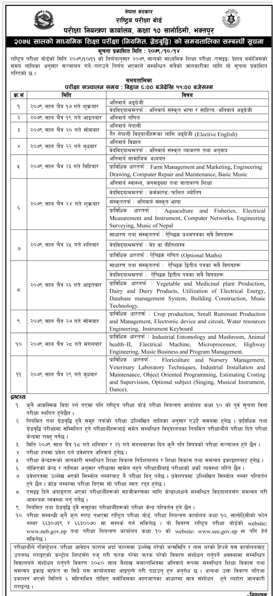 बोर्डको निर्णय अनुसार एसईई १७-२९ चैतसम्म हुने भएको छ। परीक्षा बिहान ८ बजेदेखि ११ बजेसम्म हुनेछ।